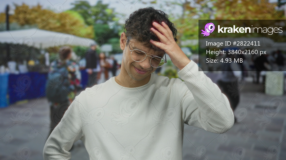 Man wearing glasses and white shirt touches curly hair with hand on head at outdoor street market in the city; frustration.