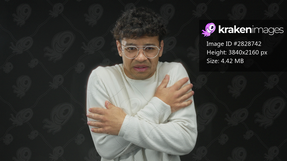 Man wearing glasses and white sweater shivering while crossing arms over chest in a black studio; discomfort.