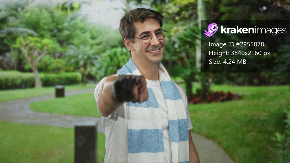 Man wearing glasses and white t-shirt with blue striped scarf points right hand toward camera on paved path in forest, smiling and leaning slightly; friendly greeting. - Kraken Images