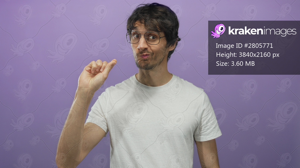 Man wearing glasses and white t shirt calmly pinches fingertips by lips in purple studio setting with an intense gaze; concentration.