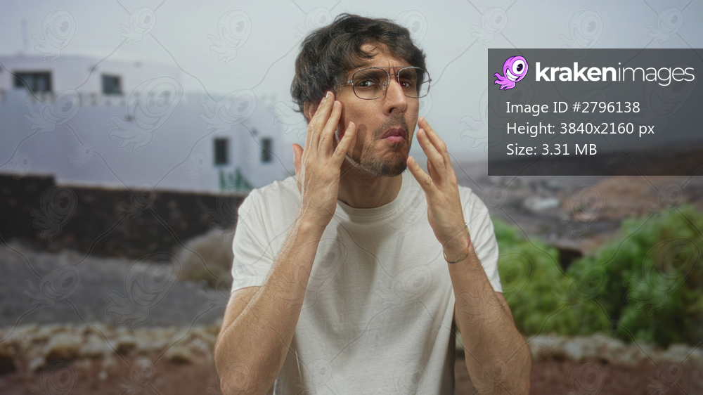 Man wearing glasses and white t shirt touches cheek outdoors by white building and rough stone wall; toothache.