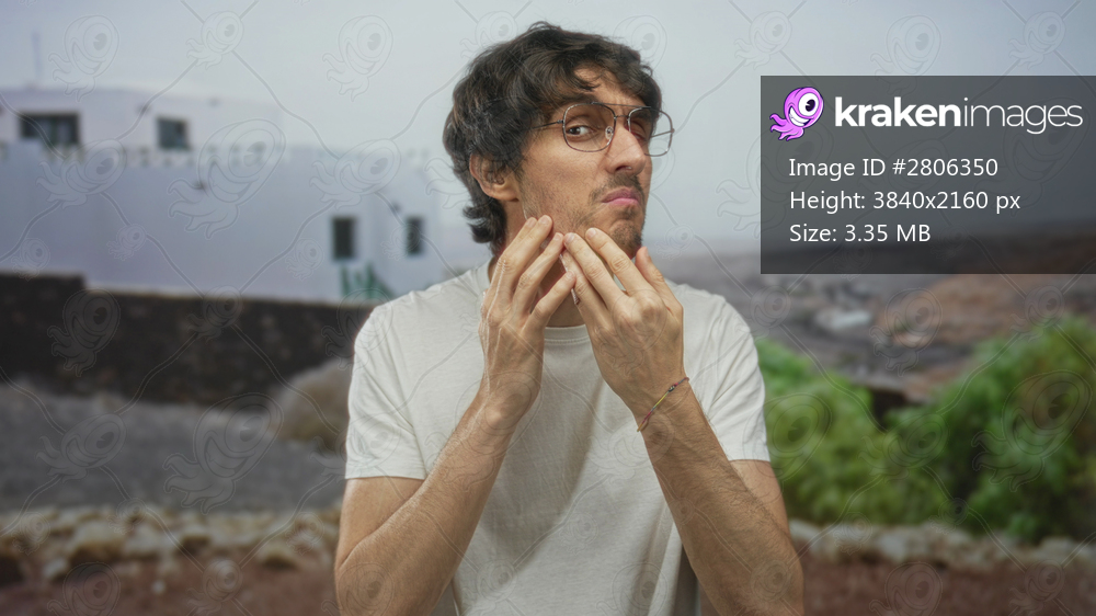 Man wearing glasses and white t shirt touches cheek outdoors by white building and rough stone wall; toothache.