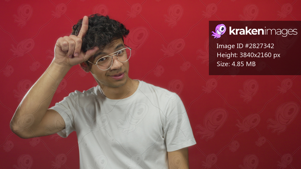 Man wearing glasses and white tshirt makes l sign with finger on forehead in red studio; playful teasing.