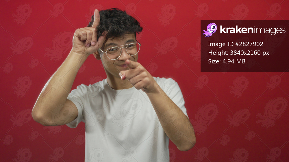 Man wearing glasses and white tshirt makes l sign with finger on forehead in red studio; playful teasing.