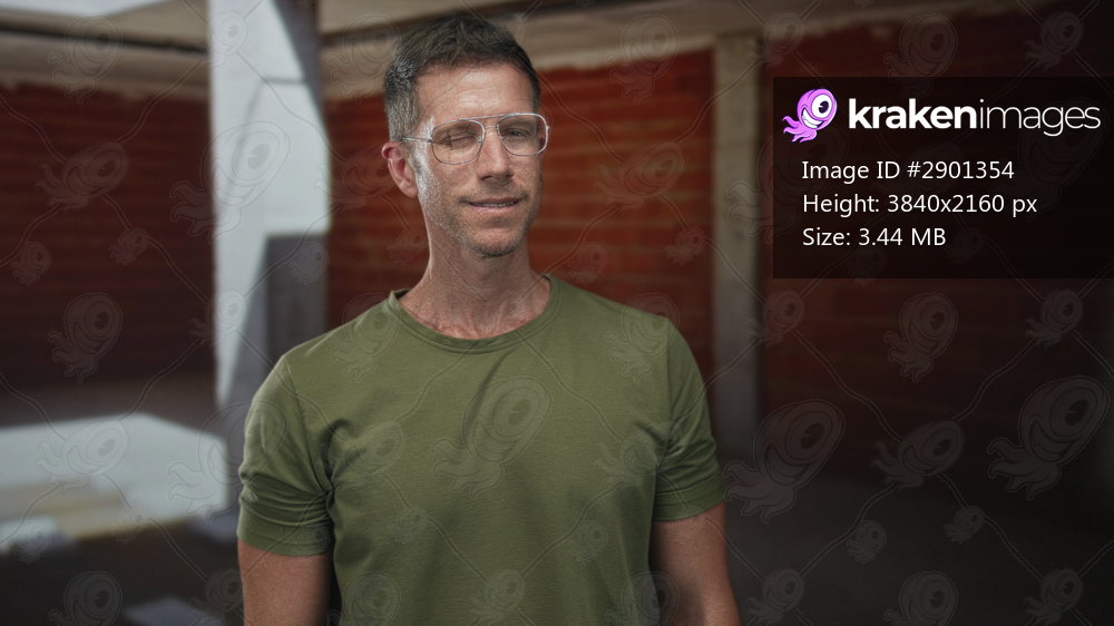 Man wearing glasses winking in building with exposed brick and pillars, casual green shirt visible; confidence.
