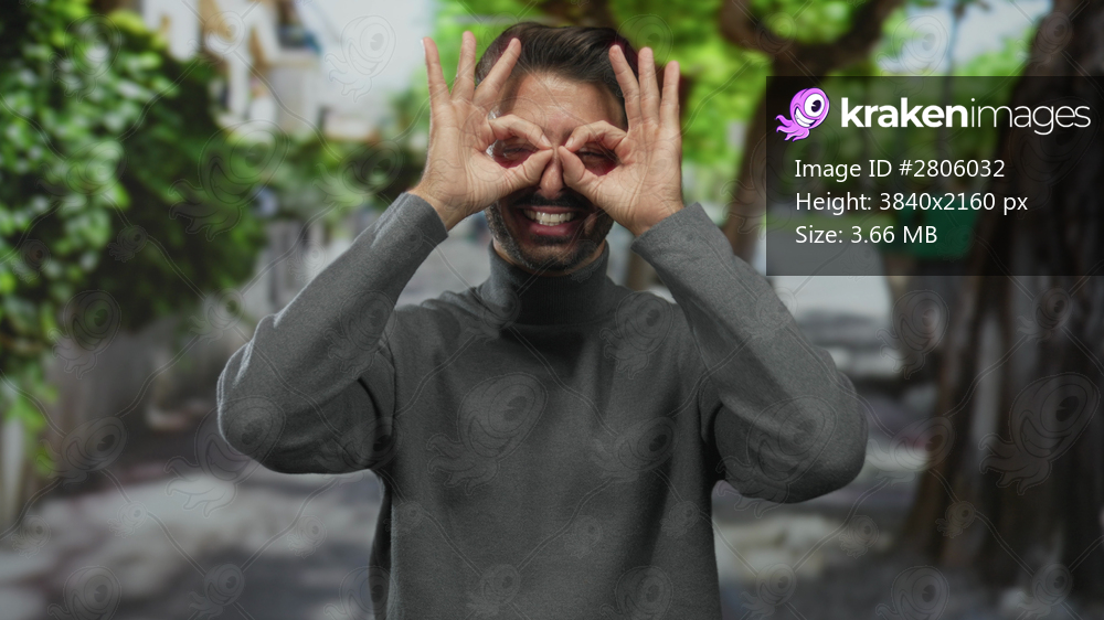 Man wearing gray turtleneck makes hand binocular gesture to eyes in a green park; exploration imagination joy curiosity.