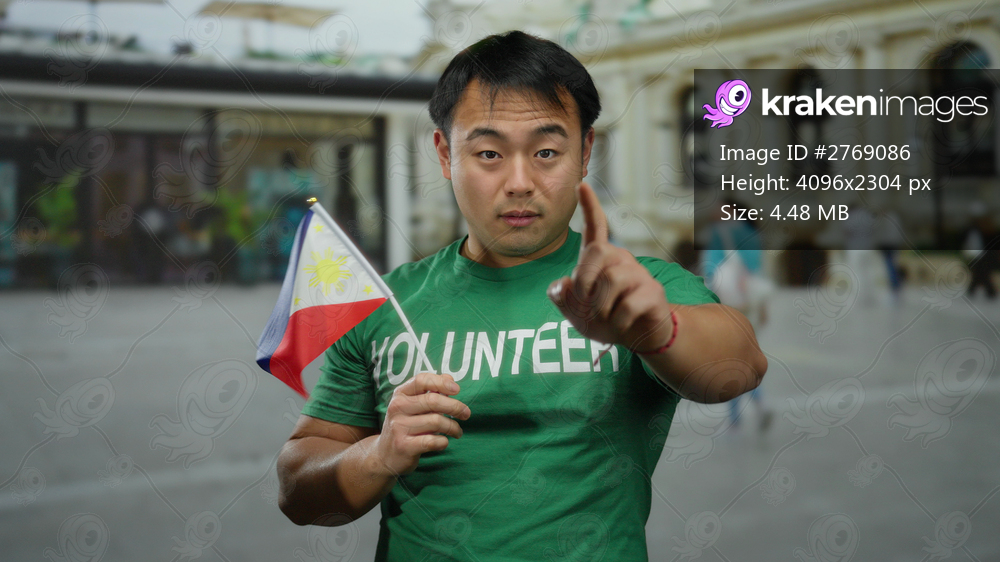 Man wearing green shirt with volunteer text holding a philippine flag on city street, making a hand gesture, portraying diverse culture and social engagement in an urban setting. - Kraken Images