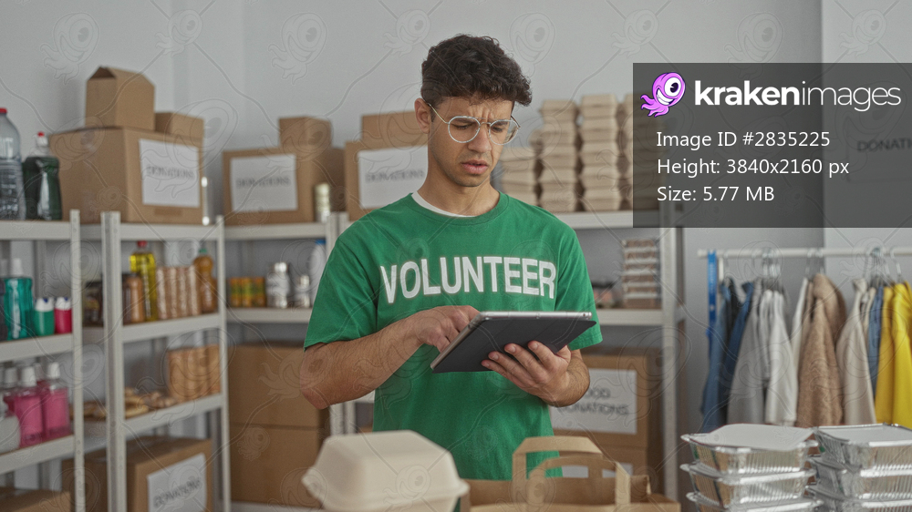 Man wearing green volunteer shirt holds tablet and points finger at food boxes in donation center building; teamwork service organization determination. - Kraken Images