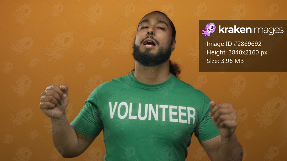 Man wearing green volunteer shirt pointing fingers and clenching fist in studio; community service enthusiasm.