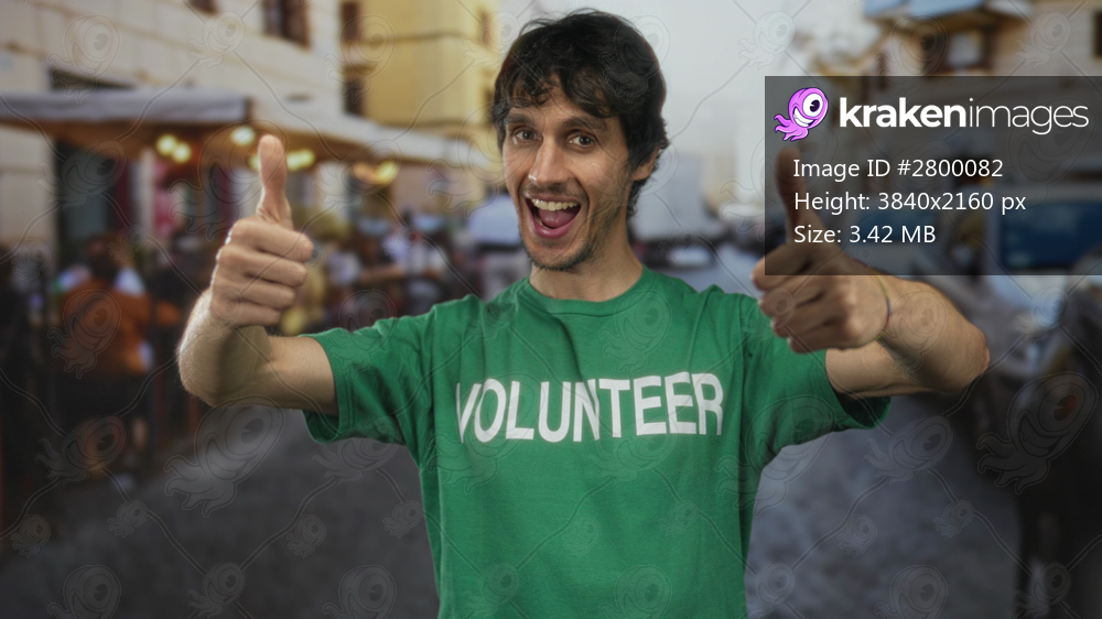 Man wearing green volunteer shirt shows thumbs up with hand while smiling on restaurant terrace indoors; optimism.