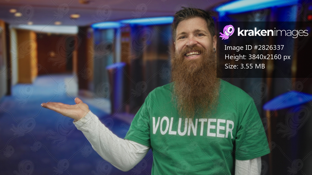 Man wearing green volunteer shirt stands smiling and shows open palm gesture in hotel building; kindness.