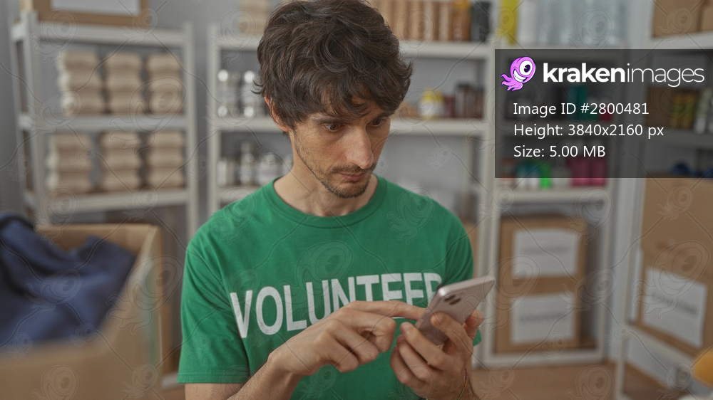 Man wearing green volunteer shirt taps smartphone in donation center building; support community caring enthusiasm.