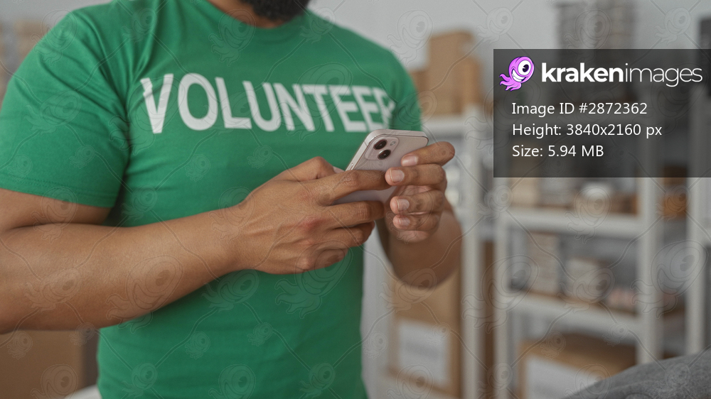 Man wearing green volunteer shirt texting on smartphone with hands in donation center building; community service compassion.