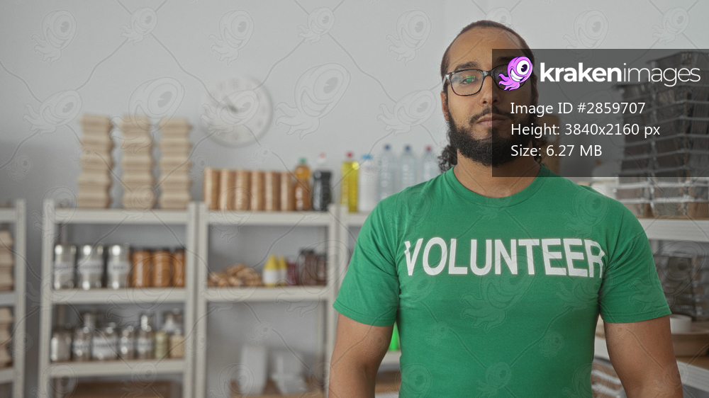 Man wearing green volunteer t-shirt stands with arms visible and looks at camera inside a donations center building; compassion service.
