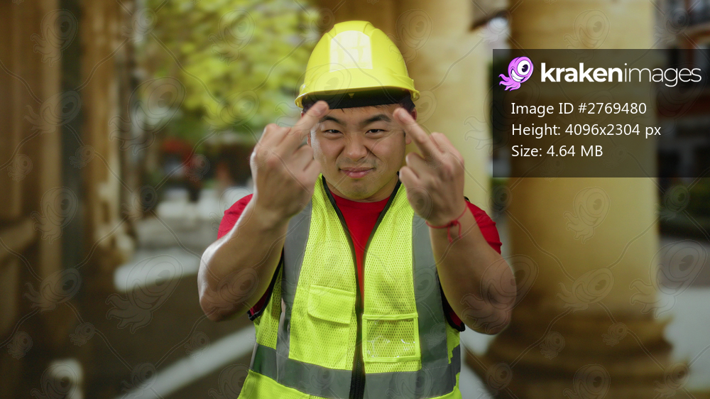 Man wearing hard hat and reflective vest making a gesture on city street with columns and trees in background.