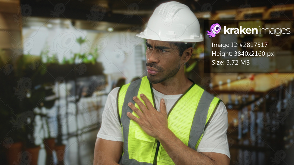 Man wearing hardhat and hi vis vest places hand on chest and looks worried in building; concern responsibility.