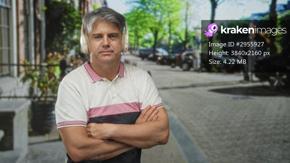 Man wearing headphones with arms crossed standing on a tree lined street near parked cars and storefronts; calm reflection.