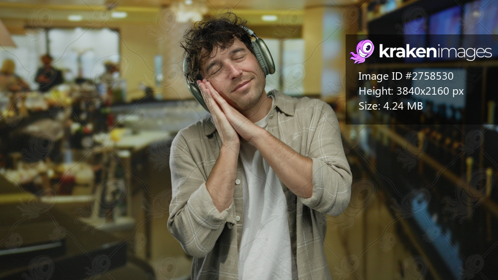 Man wearing headphones gestures sleeping in a lively bar environment, exuding relaxation and comfort amidst the bustling indoor setting.