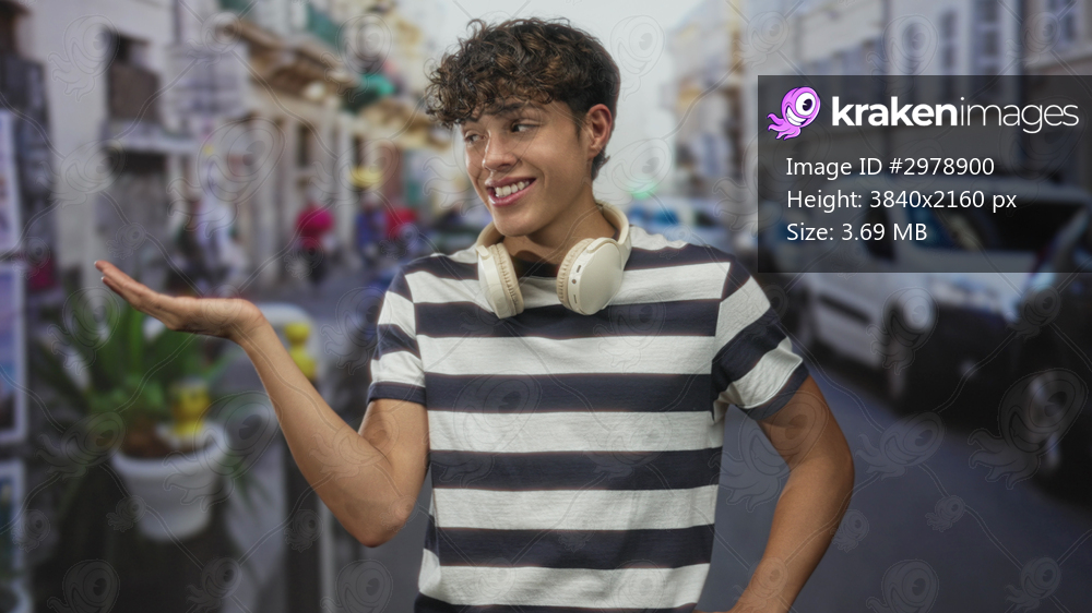 Man wearing headphones gesturing with hand on a busy street with parked vans and planters; playful attitude.