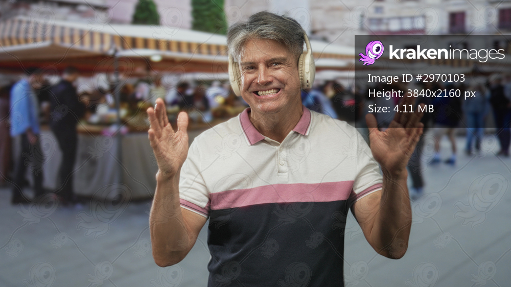 Man wearing headphones, hands raised palms forward smiling amid a busy street with market stalls and blurred crowd; joyful listening.