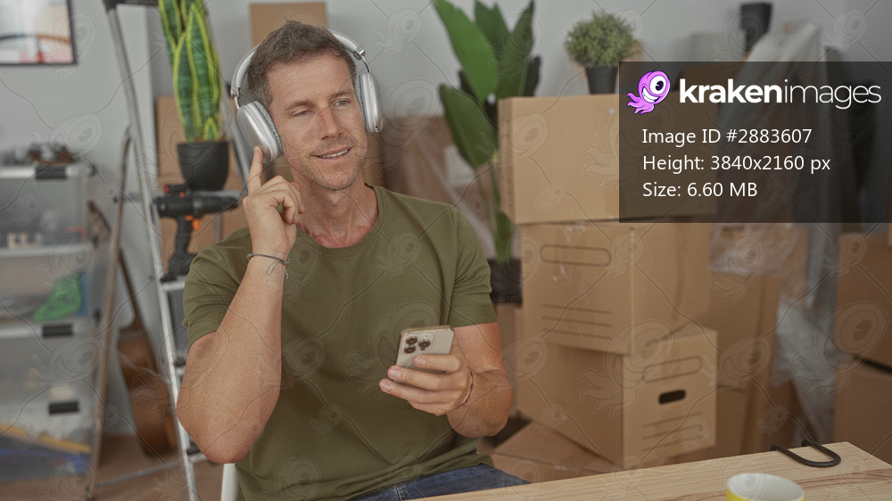 Man wearing headphones holds smartphone and touches headphone in house among moving boxes; relaxation moving day.