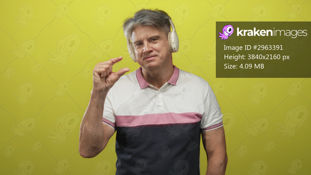 Man wearing headphones pinching thumb and index finger to show small size while wearing a polo shirt against a yellow studio backdrop; skepticism.