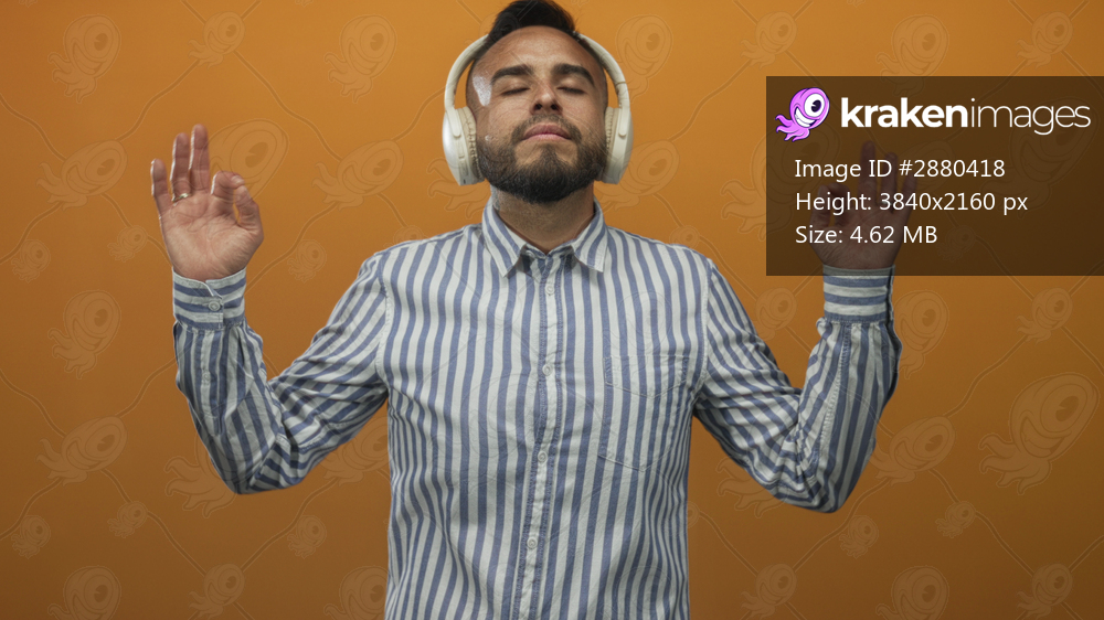 Man wearing headphones and striped shirt with hands making ok meditation gesture and closed eyes in orange studio; calm focus.