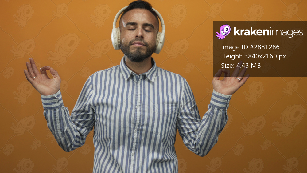 Man wearing headphones and striped shirt with hands making ok meditation gesture and closed eyes in orange studio; calm focus.