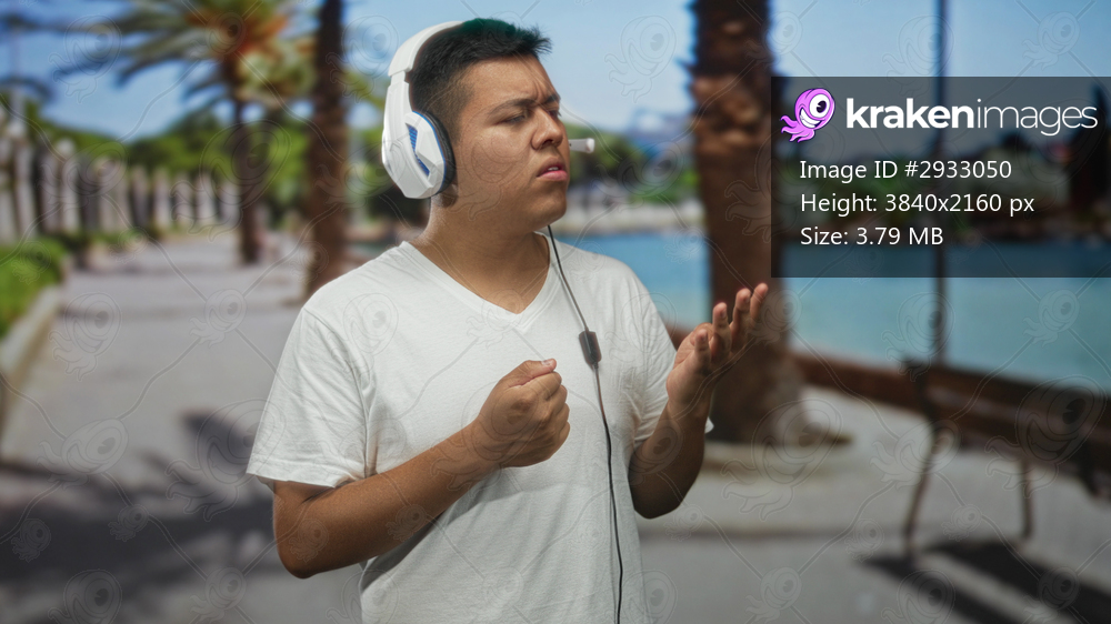 Man wearing headset with clenched fist singing while holding microphone cable on a street; music practice focus.