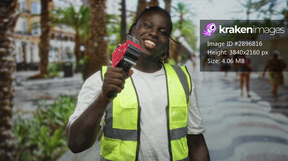 Man wearing high visibility vest holding a tape dispenser and smiling on a busy palm lined street; cheerful service.
