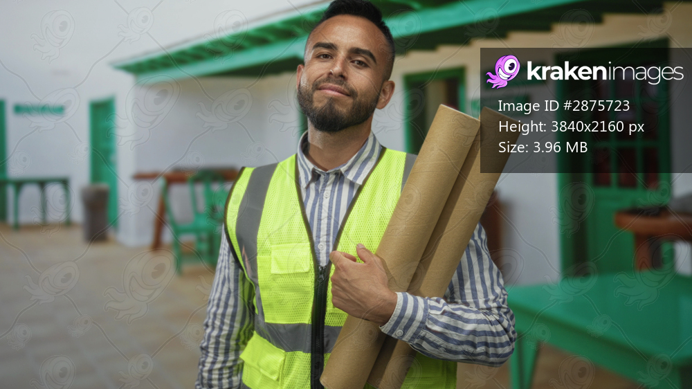 Man wearing high visibility vest holding rolled plans and giving ok sign in front of building entrance; professional confidence.