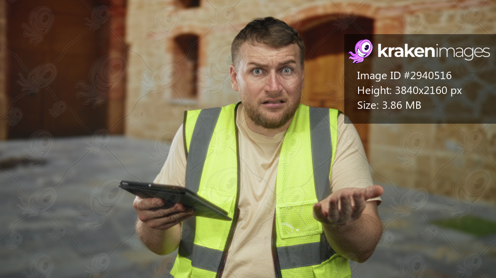 Man wearing high visibility vest holding tablet with palms up on cobblestone street in old town building; confusion uncertainty.
