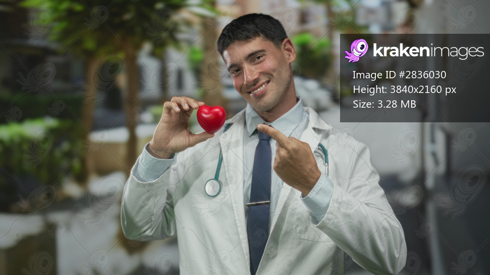 Man wearing lab coat and stethoscope points finger to red heart model on city street; health awareness.