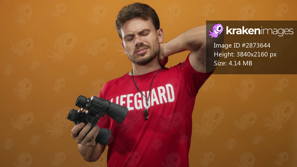 Man wearing lifeguard shirt holding binoculars with hand on neck for neckache in orange studio; discomfort.