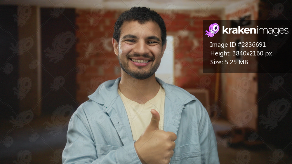 Man wearing light blue jacket smiling and giving thumbs up in building; confidence optimism motivation ambition.