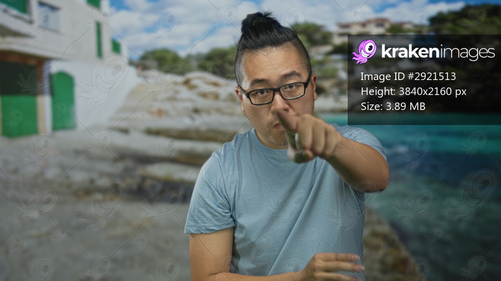 Man wearing light blue tshirt and glasses points finger at camera with arms crossed in studio backdrop; confidence focus.