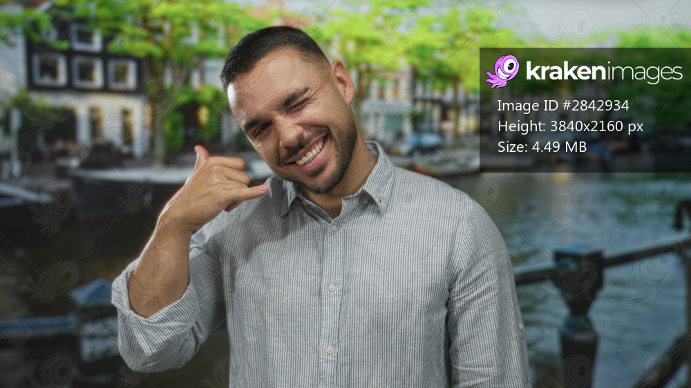 Man wearing light striped shirt shows callme hand gesture with fingers near ear and winks while smiling on street; friendly connection.