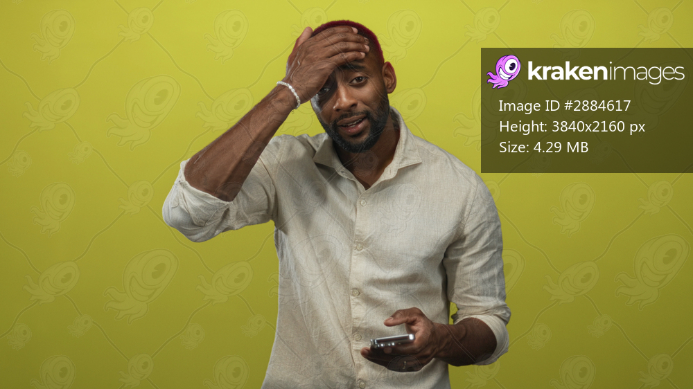 Man wearing linen shirt holding smartphone and touching forehead in studio with chartreuse wall; frustration focus.