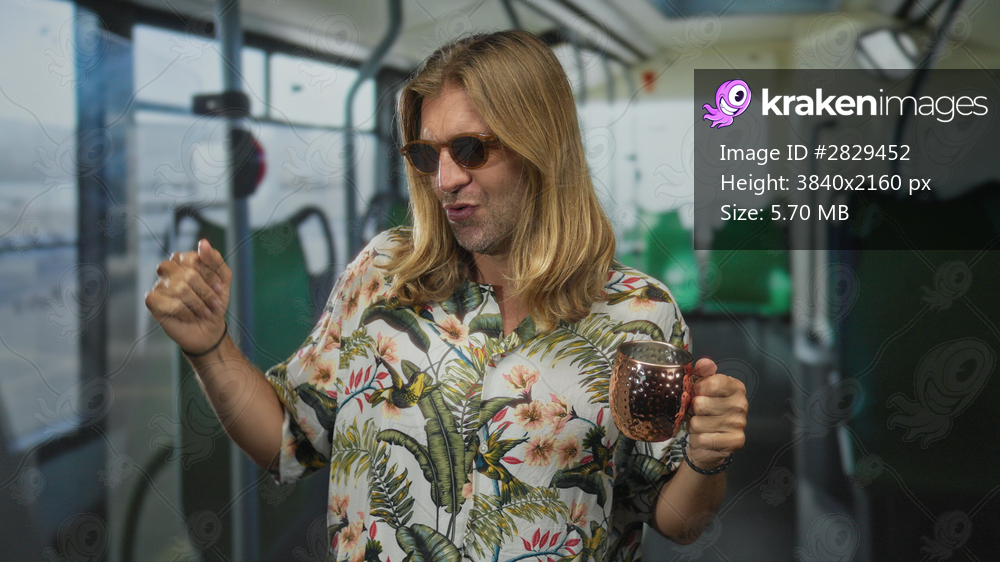 Man wearing loose floral shirt pumping fist and holding copper mug on bus interior; vacation joy.
