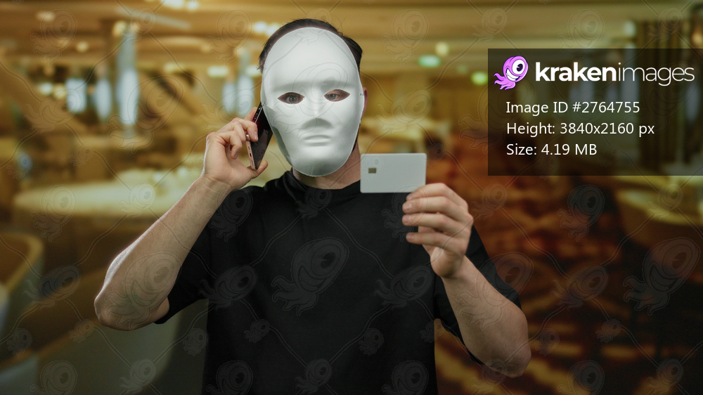 Man wearing mask holding card while speaking on phone in restaurant setting portraying mystery and anonymity indoors highlighting technology and communication theme. - Kraken Images