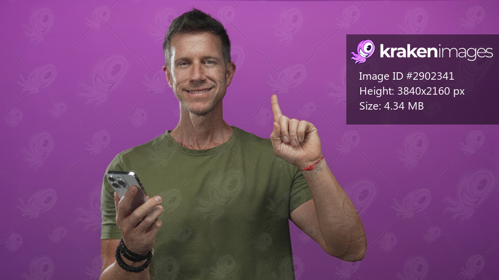 Man wearing olive green t shirt holding smartphone and flashing peace sign with raised right hand in studio with magenta backdrop; casual confidence.