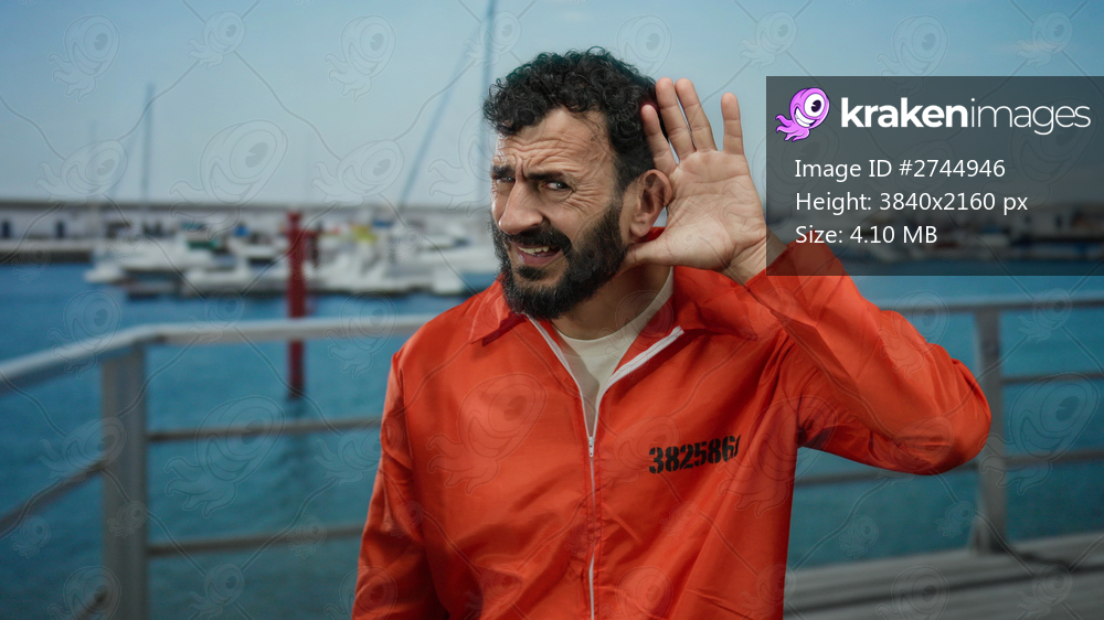 Man wearing orange jumpsuit with beard stands at port filled with ships and boats while holding hand to ear in listening gesture against sea backdrop.