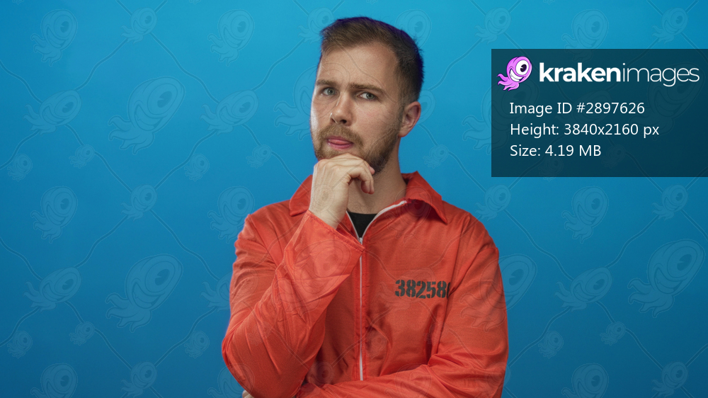Man wearing orange prisoner jumpsuit with number 38258 and hand on chin in blue studio; thinking reflection.