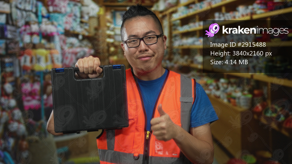Man wearing orange reflective vest holding black case in building aisle with shelves and products visible; safety readiness.