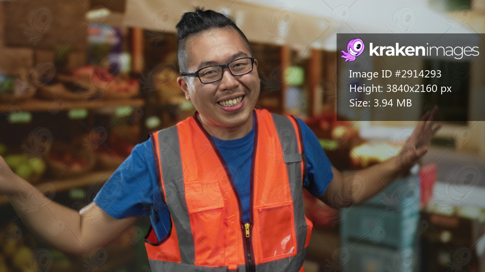 Man wearing orange reflective vest holds vest at chest and smiles with hands clasped in a street market stall full of fruit; happiness community service. - Kraken Images