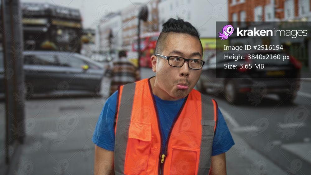 Man wearing orange reflective vest pouting with pursed lips on a busy city street near traffic and red bus; confusion.
