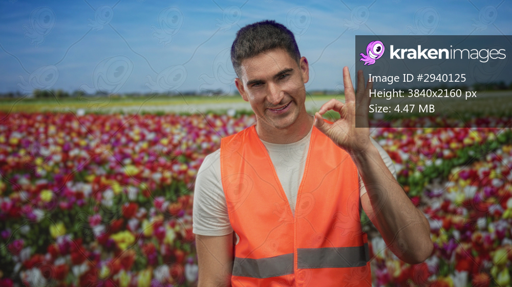 Man wearing orange safety vest making ok sign with hand among tulip flowers in studio field, smiling and standing; approval spring work.