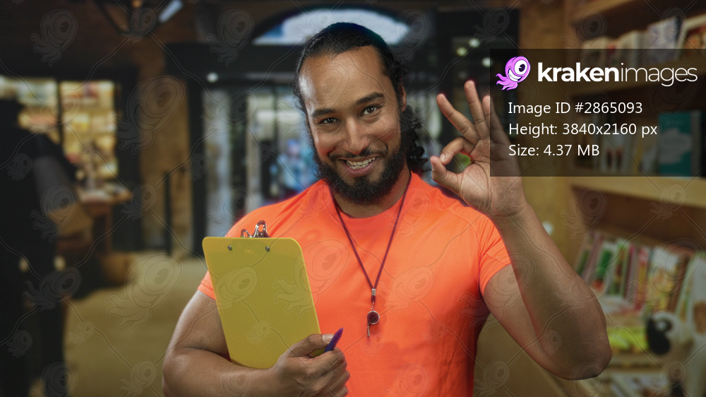 Man wearing orange shirt holding a yellow clipboard and making ok sign while smiling by bookshelves in a library entrance; approval guidance.
