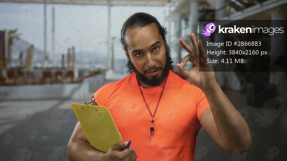 Man wearing orange shirt holding yellow clipboard while right hand makes ok sign in building; safety approval.