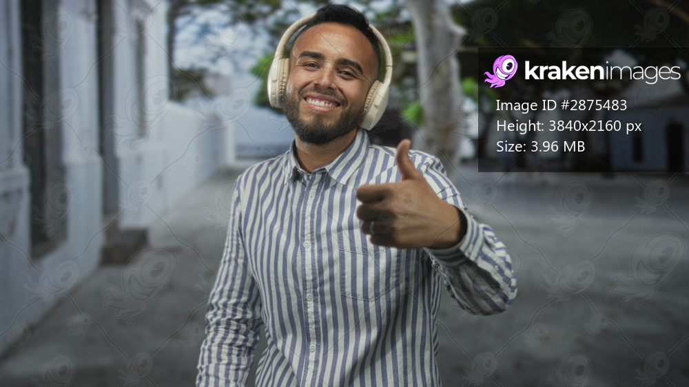 Man wearing over ear headphones gives thumbs up with visible thumb and broad smile on a sunny street lined with white buildings and trees; confidence.